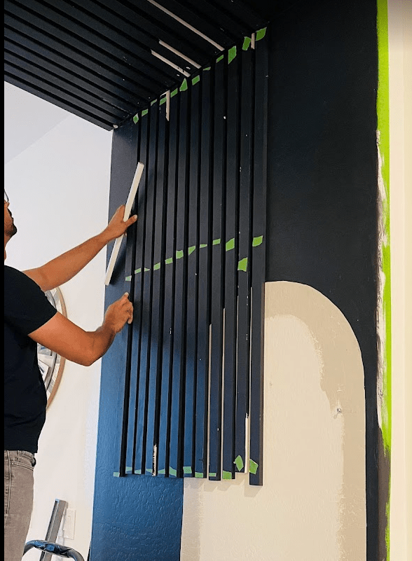 First let’s understand if we should just nail the slats to the wall or apply glue and then nail them. My vote is always NO GLUE! When working on feature walls it’s important to acknowledge that your preference could change few years down the lane and if we use glue, ripping these down will cause significant damage to your walls. Without glue, it would mean just a bunch of holes that can be easily repaired.