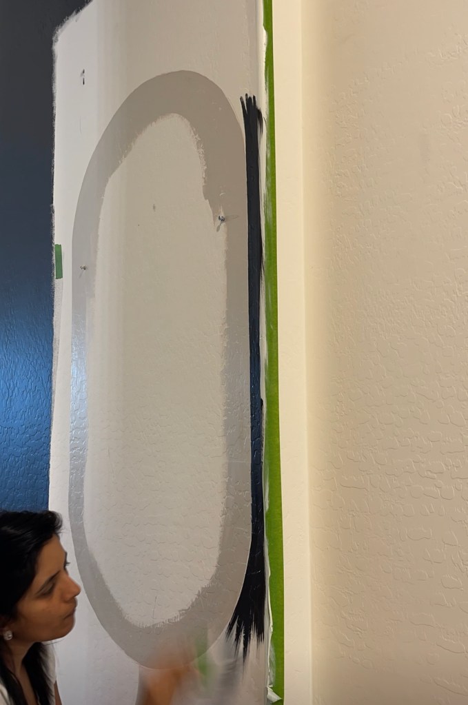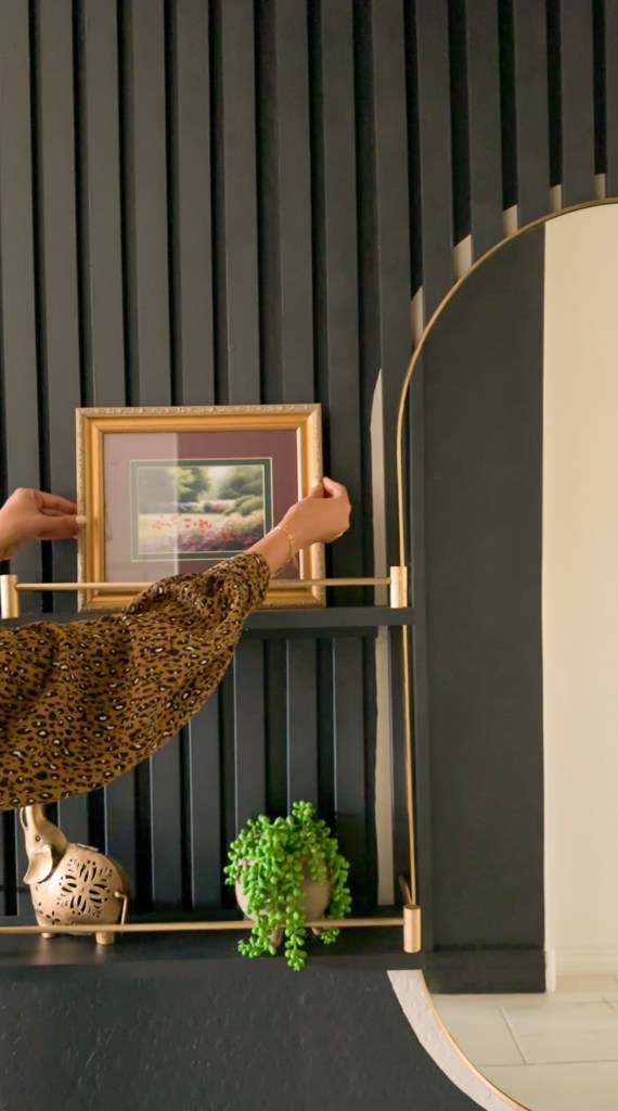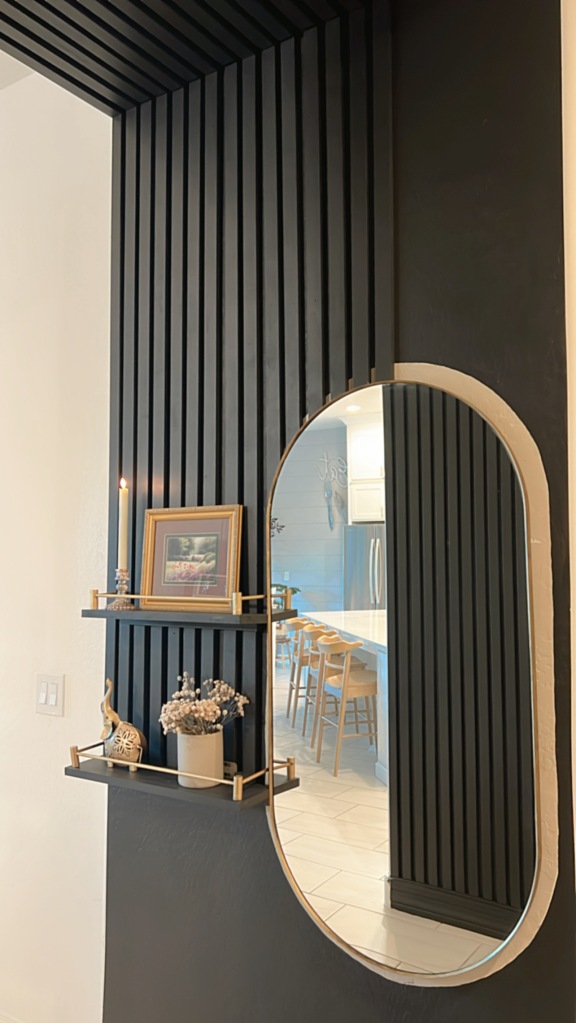 I really wanted this wall to stand out in our long hallway so I decided to go all black. I used color Blackish from Clare paint. I first mounted the mirror to the wall and did a free hand border of about 2″ and painted it with a left over light beige color. Then painted rest of the wall in the new color. I also painted all the slats in the same color.