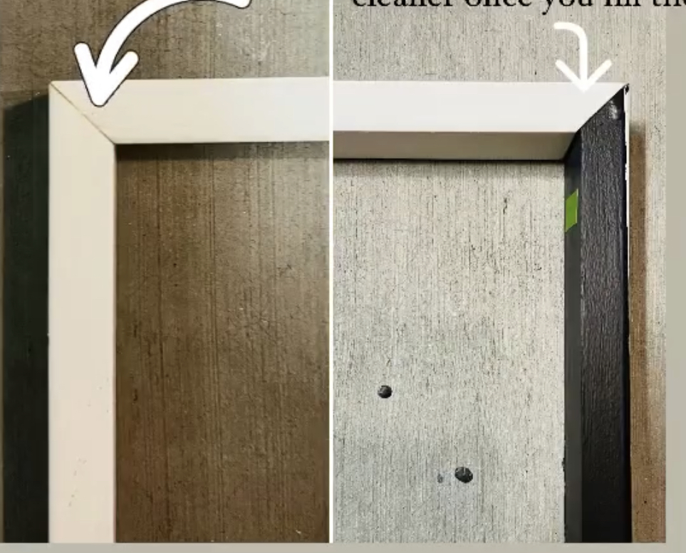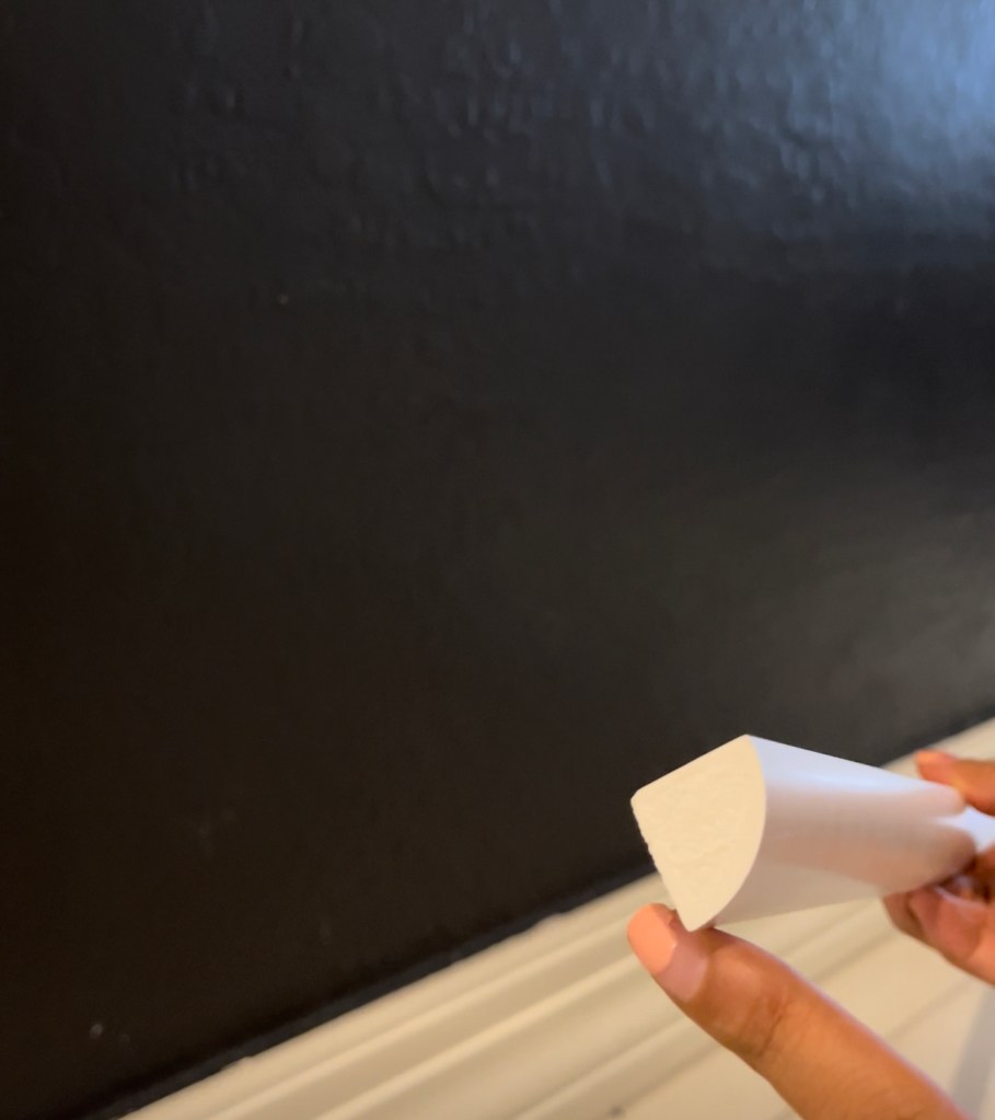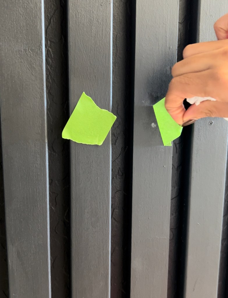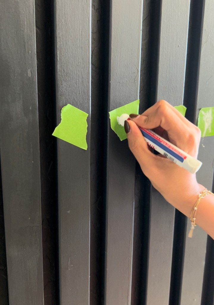 Next, time to fill in all the nail holes. Sometimes nails may have slightly popped out, in cases like these I prefer to use a nail setter. A nail set is a small metal tool that allows you to hammer the finish nail flush to, or slightly below, the surface of the wood while keeping the hammerhead a safe distance away. Once the nails are set, I used a fill stick to fill nail holes, it as easy as scribbling with a pen. You just scribble with the stick on the painters tape where you have nailed the wall. Now just peel off the tape and paint over. It’s such an easy hack to fill nail holes without sanding or smudging! Saves SO much time!