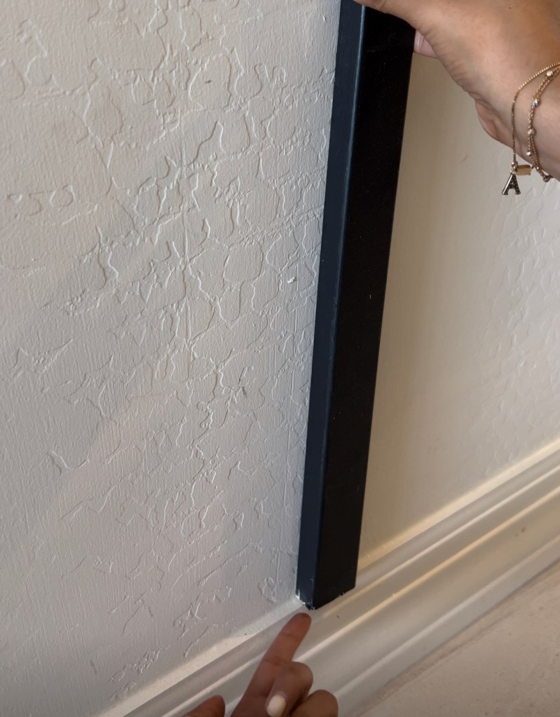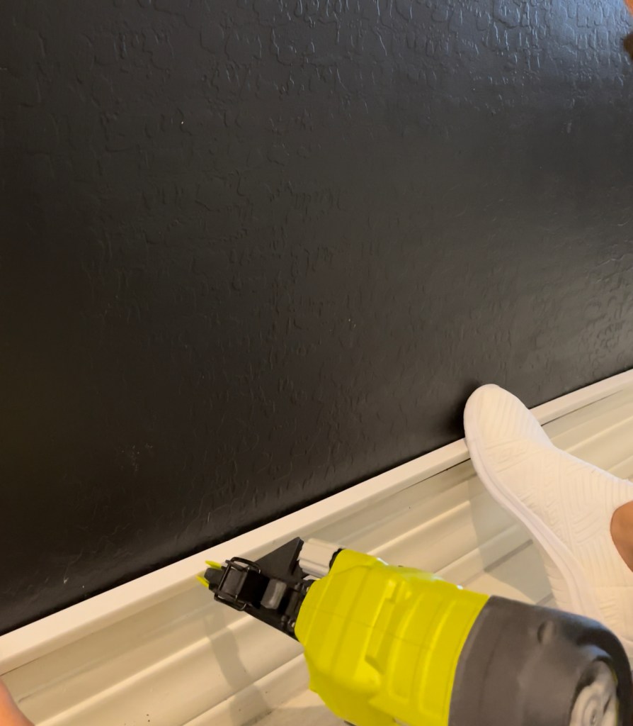 Now that we have the walls and slats ready, let’s begin the install. Since our slats are approx 3/4 thick, installing them over your baseboards will create an overhang. One option is to rip of the baseboards and install thicker ones. OR the second and my favorite option is to use a 3/4in quarter round to extend the baseboards and create a lip for your slats to sit on.