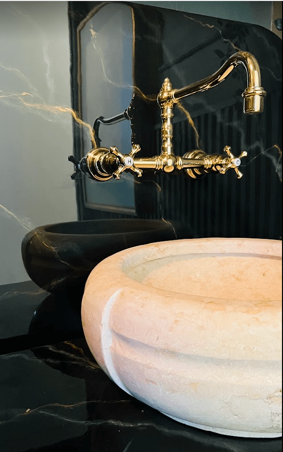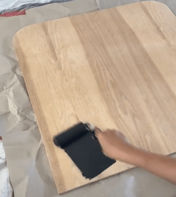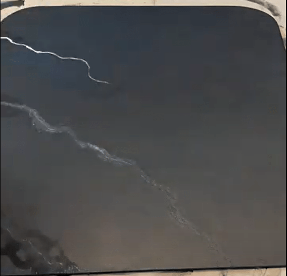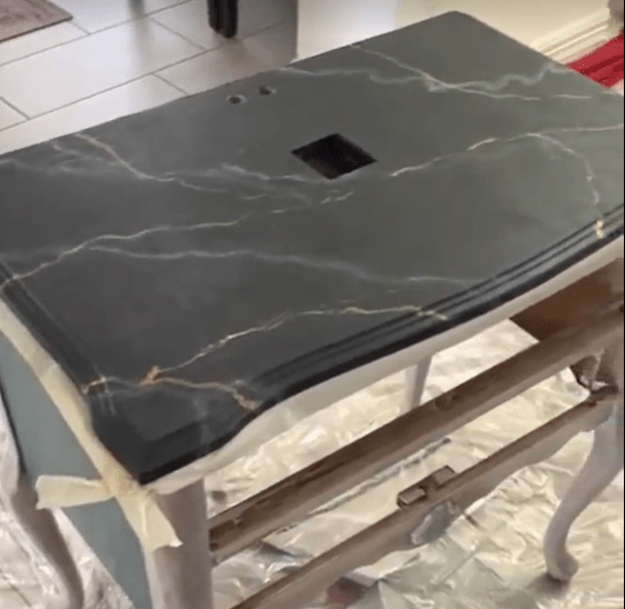 - Next, we painted both the vanity top and backer board black. Now was the time to get creative and create the marble pattern. Mix your white, golden, and gray acrylic paints to create the desired shades for your faux marble. Experiment with different swirls and patterns to achieve a natural marble look. Using a thin paintbrush draw marble veins on the board. Spray with some water and blend. Let it dry completely. I used a marble contact paper as reference to play around with the pattern.